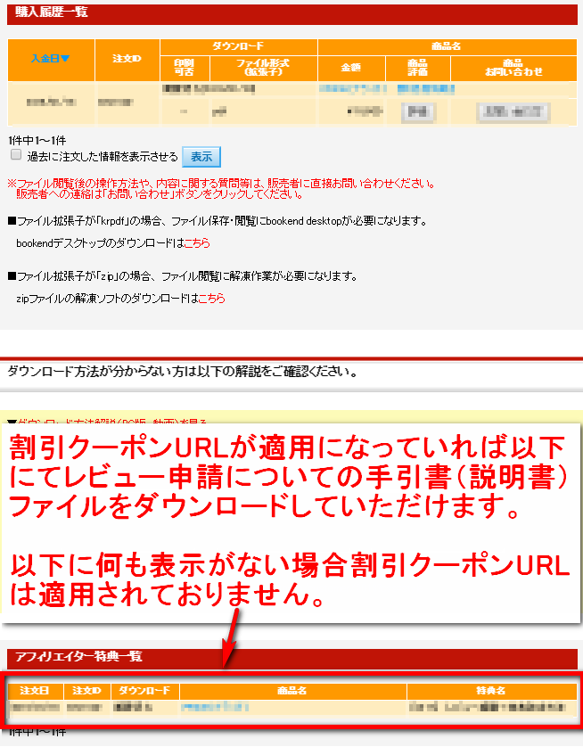 問題なく割引クーポンURLが適用になっていれば注文後、購入履歴から商品のダウンロードと合わせてアフィリエイター特典一覧の部分に割引クーポン請求に関するお知らせ(レビュー申請の説明書)のPDF資料をダウンロードしていただけます。